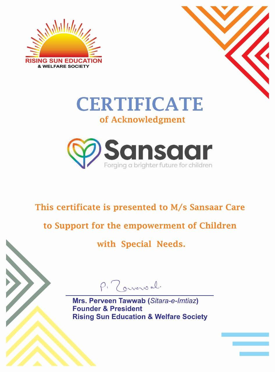 Sansaar Care provided targeted charitable sponsorship to Rising Sun Education & Welfare Society, a non-governmental organisation in Pakistan supporting children with special educational needs and disabilities.